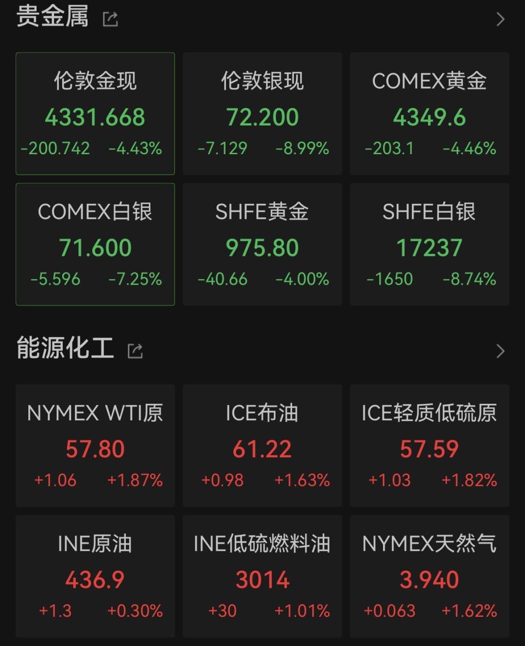 当日市场的焦点,无疑集中在贵金属市场突如其来的暴跌上。这一轮金属上涨狂潮的“带头大哥”白银,在日内创下每盎司82美元新高后,上演了惊心动魄的跳水行情,最终收盘跌幅接近9%。黄金期货价格也下跌约4.5%,创下近两个月来的最大跌幅。铂金和钯金的跌幅更为惨烈,现货钯金暴跌超15%。