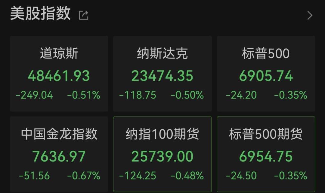 截至收盘,道琼斯工业平均指数下跌0.51%,报48461.93点;标普500指数下跌0.35%,报6905.74点;纳斯达克综合指数下跌0.50%,报23474.35点。